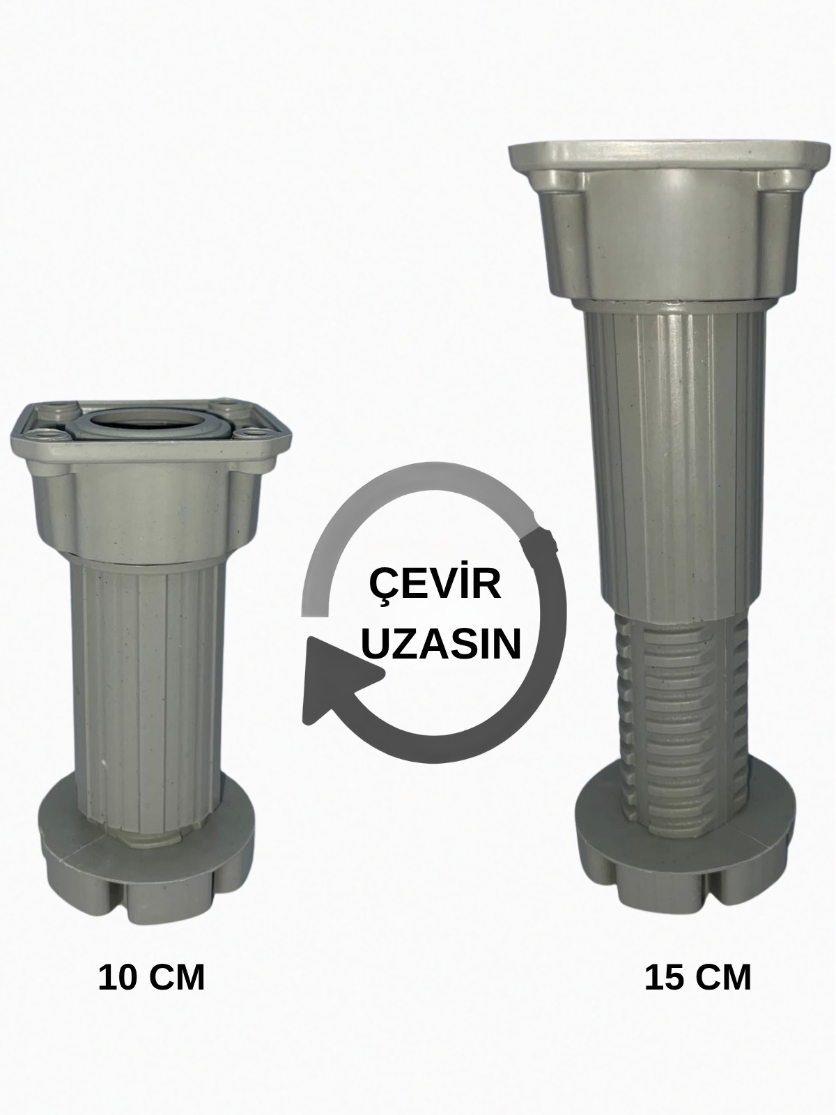 10 cm’den 15 cm’e ayarlanabilir esnek yükseklik ile mobilyalarınızı zemine ve konforunuza göre zahmetsizce ideal seviyeye getirin! Yüksek mukavemetli plastikten üretilmiş bu ayaklar, maksimum stabilite ve modern bir görünüm sunarak bazalarınıza ve dolaplarınıza anında estetik katar.
